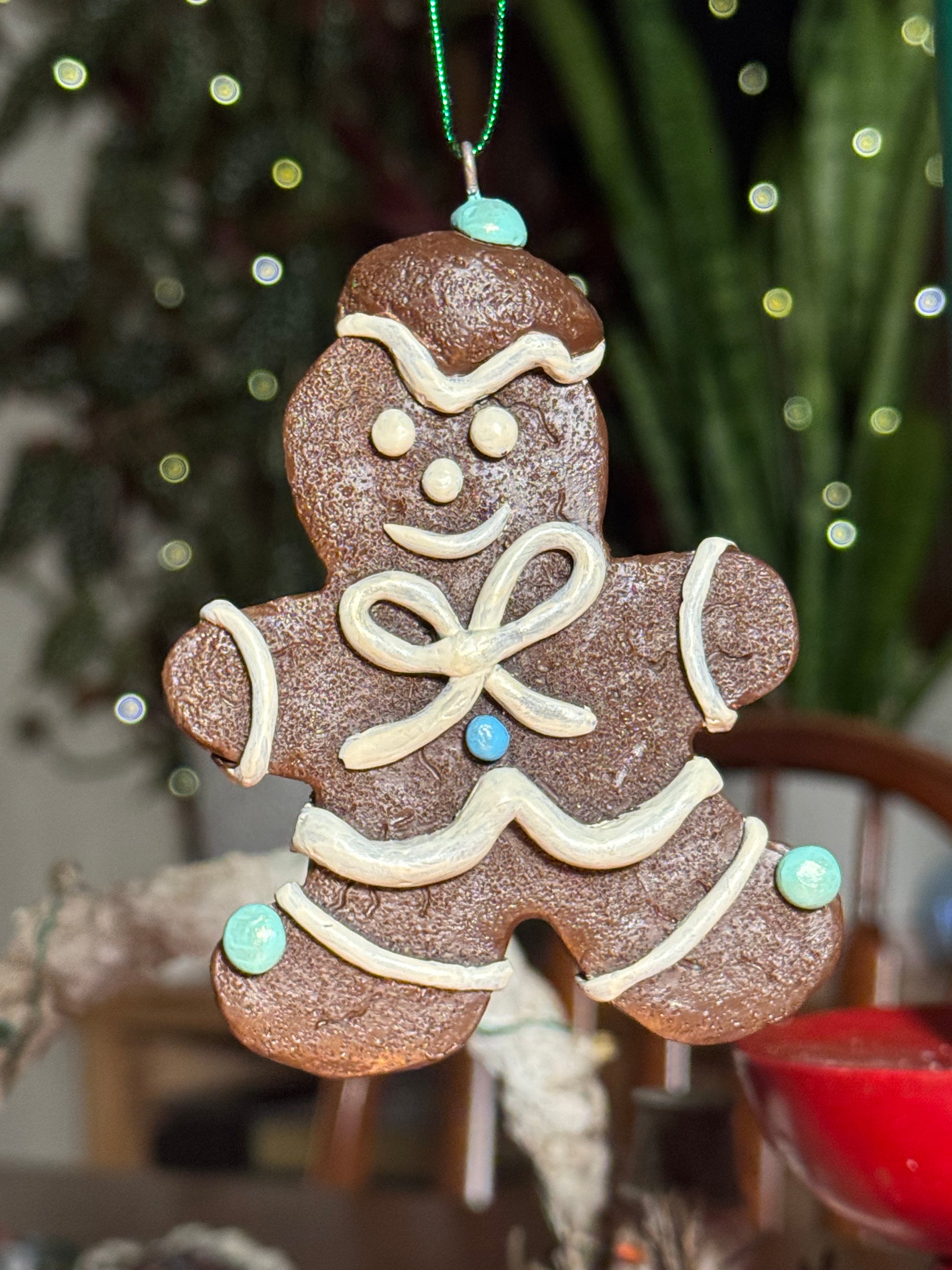 Handmade Gingerbread Man Ornament. Pennant Style with Gold Back.